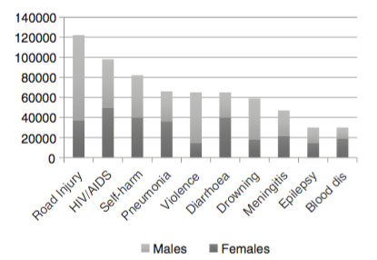 Grafik sepuluh penyebab tertinggi penyebab kematian pada kelompok usia muda[2]